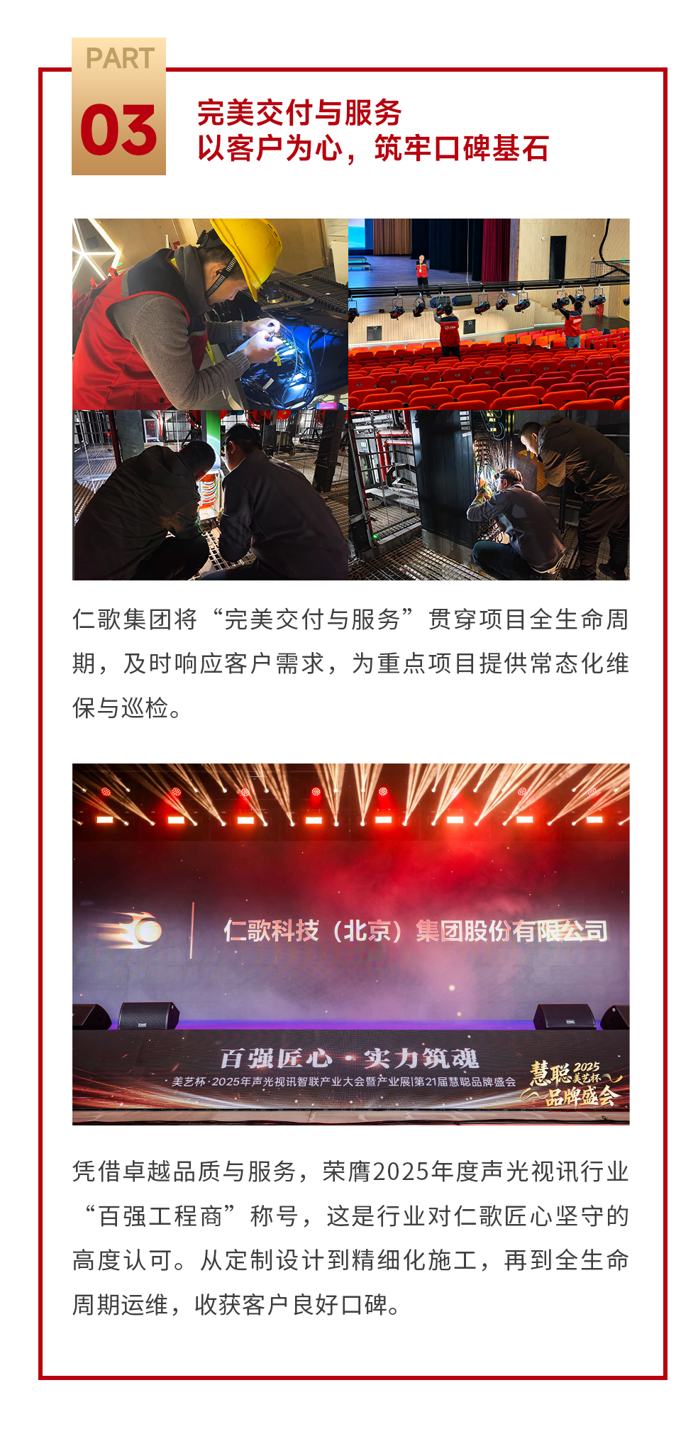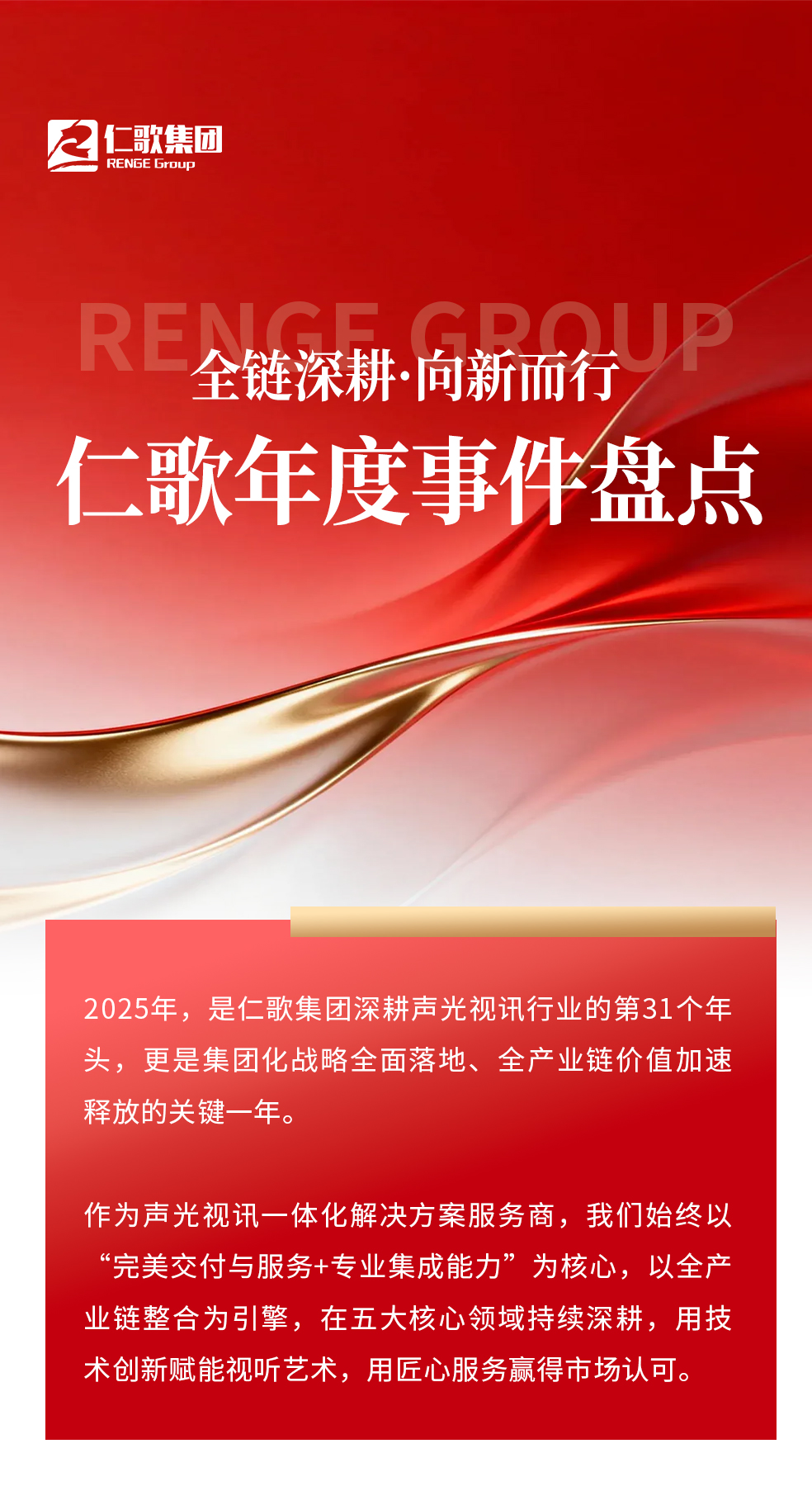 站在新起点,仁歌集团将持续深化全产业链优势,加大前沿技术研发投入,推动声光视讯与多领域深度融合。强化五大中心城市辐射能力,构建区域服务与创新基地。以开放姿态整合资源,为客户提供优质一站式解决方案,与合作伙伴共创价值,推动声光视讯行业蓬勃发展。